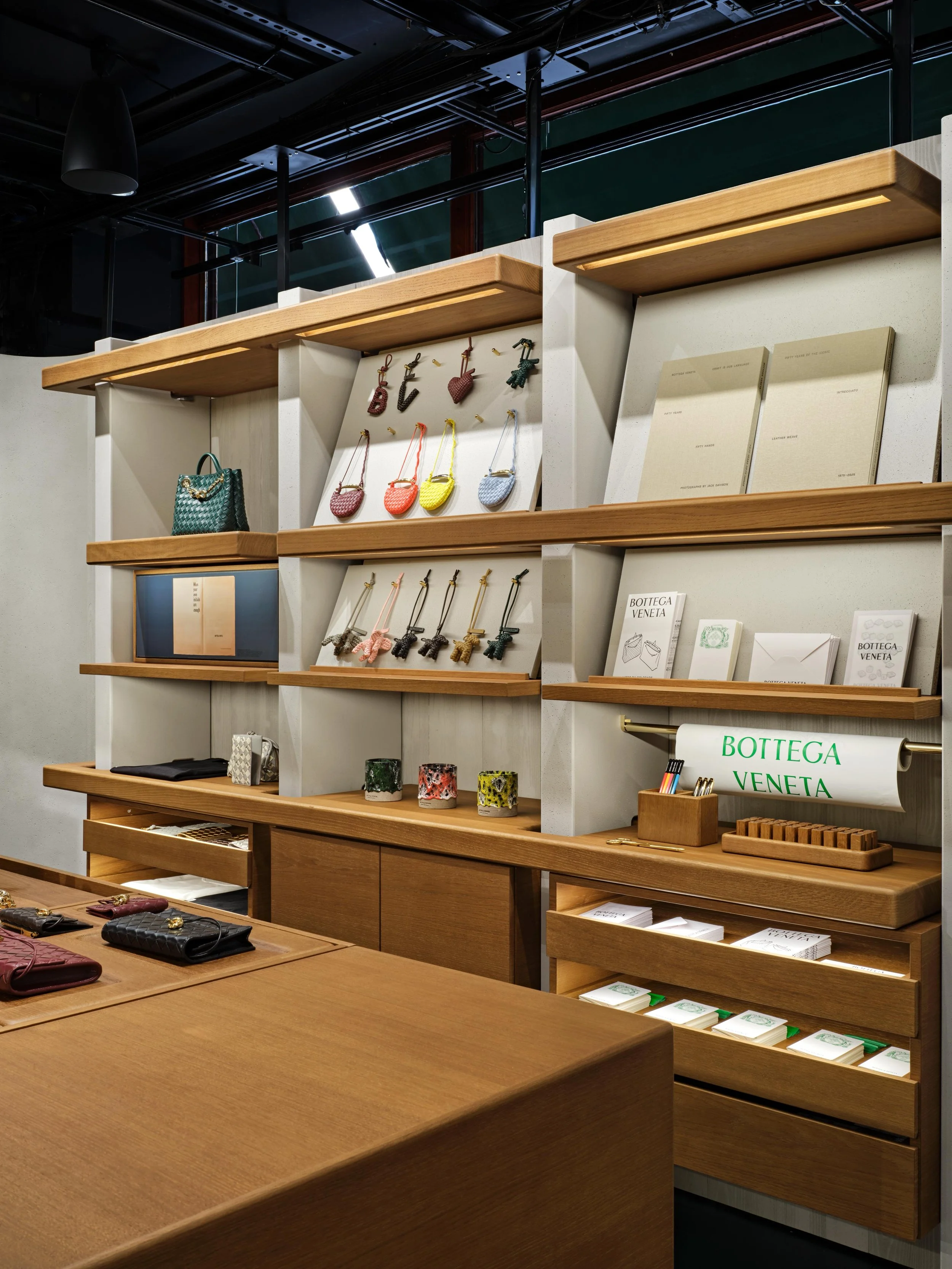 At the centre sits La Tavola, a new architectural concept that acts as both centerpiece and storytelling tool. Inspired by the communal tables in Bottega’s ateliers, it functions as a display for small leather goods, jewellery and fragrances, while offering a dedicated area that allows visitors to explore the making of Intrecciato up close. Bespoke stationery and keepsakes have also been created exclusively for Harrods, gifted with purchases to underscore the sense of rarity and occasion.