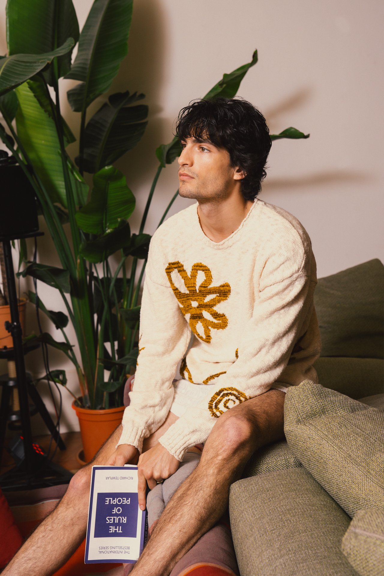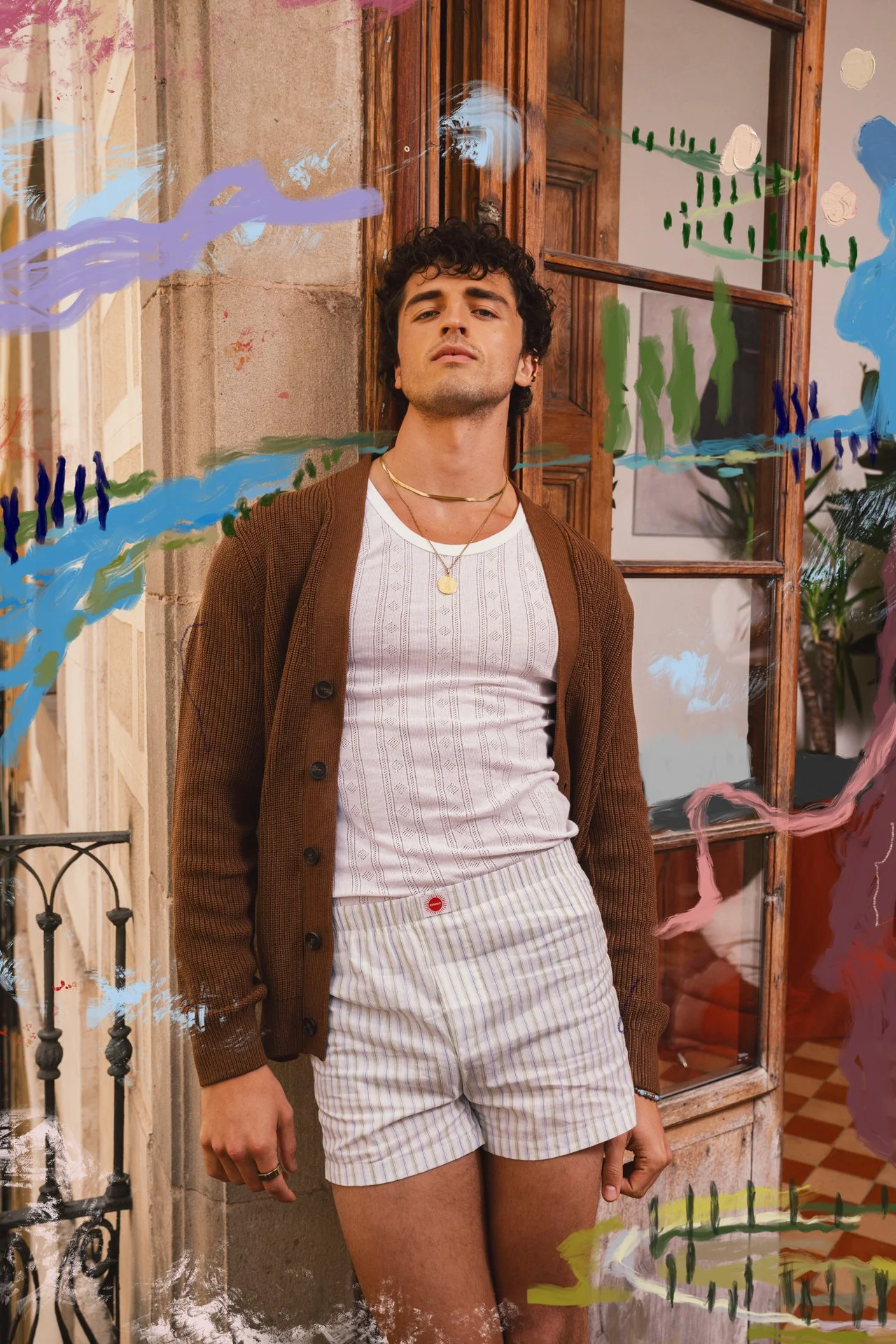 Alberto wears - gold necklace - Hugo Boss, necklace - Uno de 50, T-shirt - Inverse, shorts - Paka vintage store