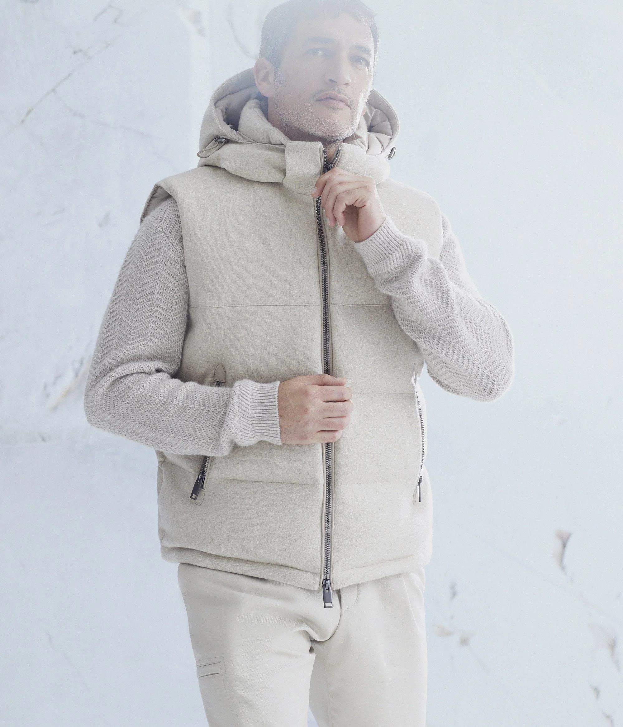Crafted almost entirely from snow white, cream and ivory shades, these garments are designed to be worn together in a full statement look, or styled as standout pieces. Hero outerwear includes the iconic car coat in a sumptuously soft shearling, a wardrobe staple, and the Yangir cashmere double-breasted overcoat that utilises classic Brioni double-splittable construction, both paying homage to the heritage of the house in a contemporary way. The sporty down puffer vest introduces a relaxed and practical piece for layering day to evening, while the Plume suit in ivory silk gabardine features an ultra-lightweight deconstructed jacket, relaxed fit and effortless finish.