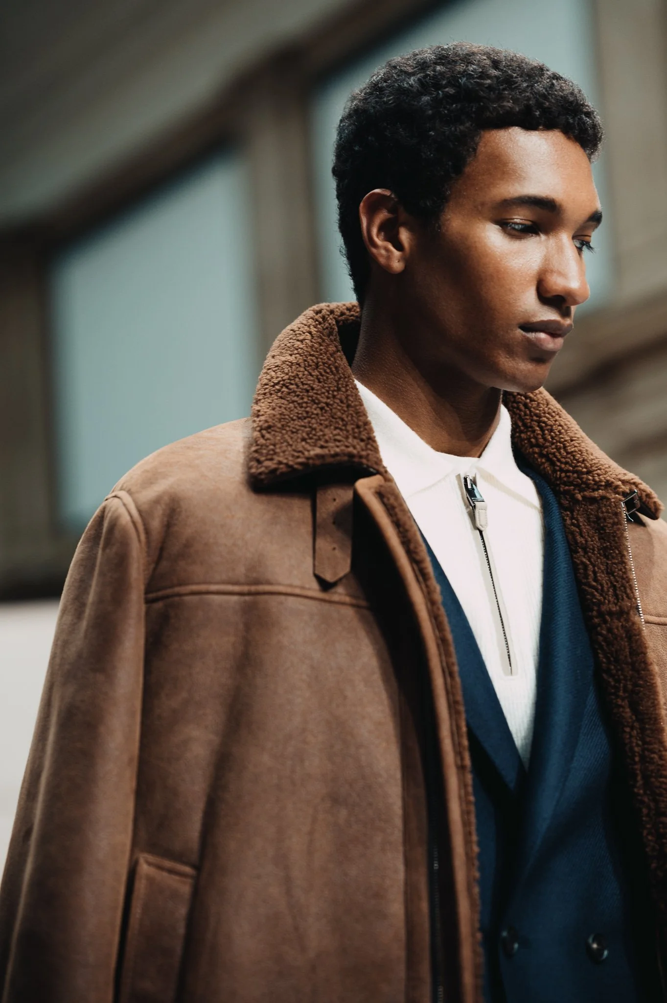 Brunello Cucinelli brought man closer to nature, centering on the contemporary explorer. Relaxed tones, subtly shortened shoulders, and softened blazer lines defined the collection, while ties crafted from the same fabric as the suits reinforced cohesion. Velvet mimicked rich denim, and shearling and suede emerged as signature textures, highlighting tactile luxury.