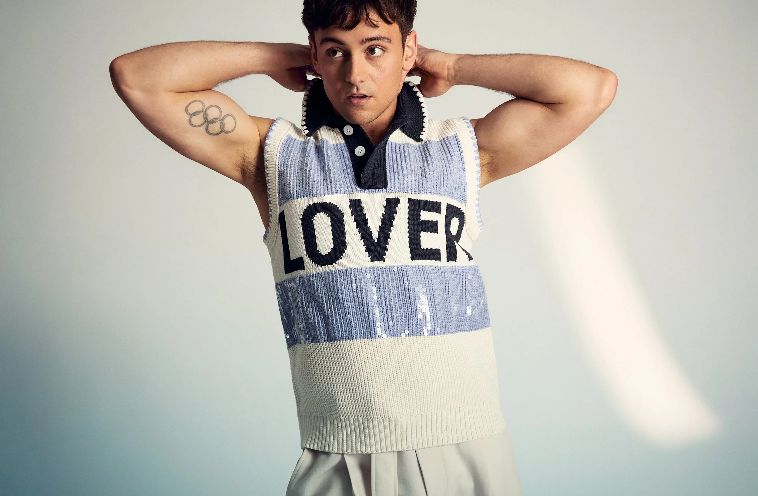 The campaign also features a specially commissioned illustration by LGBTQ+ artist Richard Kilroy, depicting two swimmers in an abstract embrace. That same image appears across branding and in a printed tee, weaving Daley’s aquatic past into the fabric of the collection.