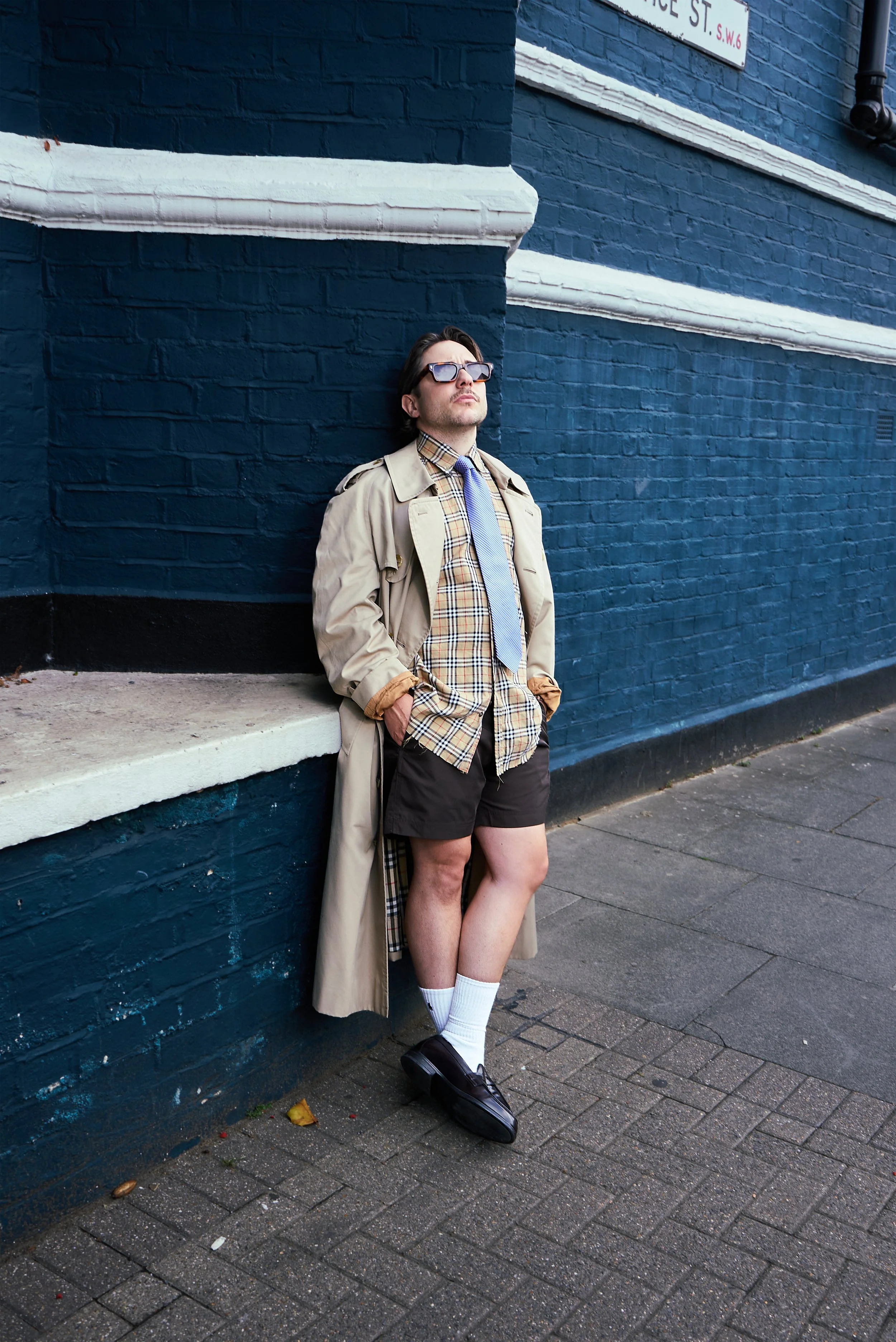 Jacket - Burberry (stylist’s archive), Shirt - Burberry (Talent’s own), Sunglasses - Jimmy Fairly, Shorts - Che, Tie - Eton, Socks - Falke, Shoes - Russell and Bromley