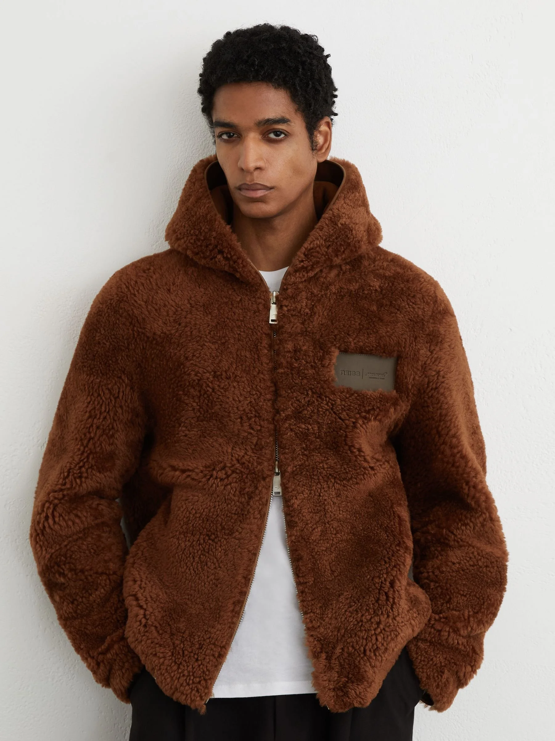 Outerwear is one of the collection’s strongest categories. A clean zip-through jacket featuring motorsport patches and McLaren branding captures the spirit of team kit but is styled firmly for everyday wear. Meanwhile textured layers – including a statement shearling-style jacket – offer a more fashion-led interpretation of the racing aesthetic.